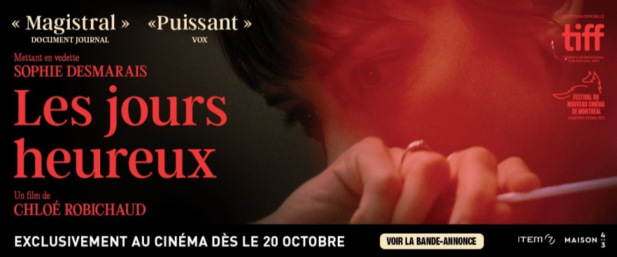 MAISON 4:3 et ITEM 7 sont heureuses d’annoncer que LES JOURS HEUREUX, écrit et réalisé par Chloé Robichaud, sera présenté en première mondiale et en Présentation Spéciale, section dédiée aux grandes figures du cinéma mondial, au Festival International du Film de Toronto (TIFF) en septembre prochain. Habituée du prestigieux festival canadien où tous ses films ont été présentés, Chloé Robichaud y remportait le Prix du meilleur court métrage canadien en 2019 avec Delphine. Film attendu, LES JOURS HEUREUX prendra l’affiche dans les cinémas québécois le 20 octobre prochain.